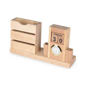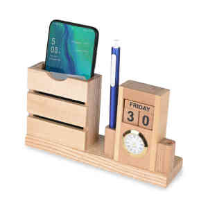 This Premium wooden desk organizer comes with an in-built watch, 2 penholder compartments, and 1 big compartment. The USP of this desk organizer is it comes with four wooden blocks where numbers and days are printed. So, it can be used as a calendar too. High-end finishing with these date blocks makes it perfect for gifting. Also, ample space for branding gives freedom to the Corporates to personalize it in their way. Ideal for gifting to the stakeholders, this unique Desk organizer will be loved by your stakeholders.
